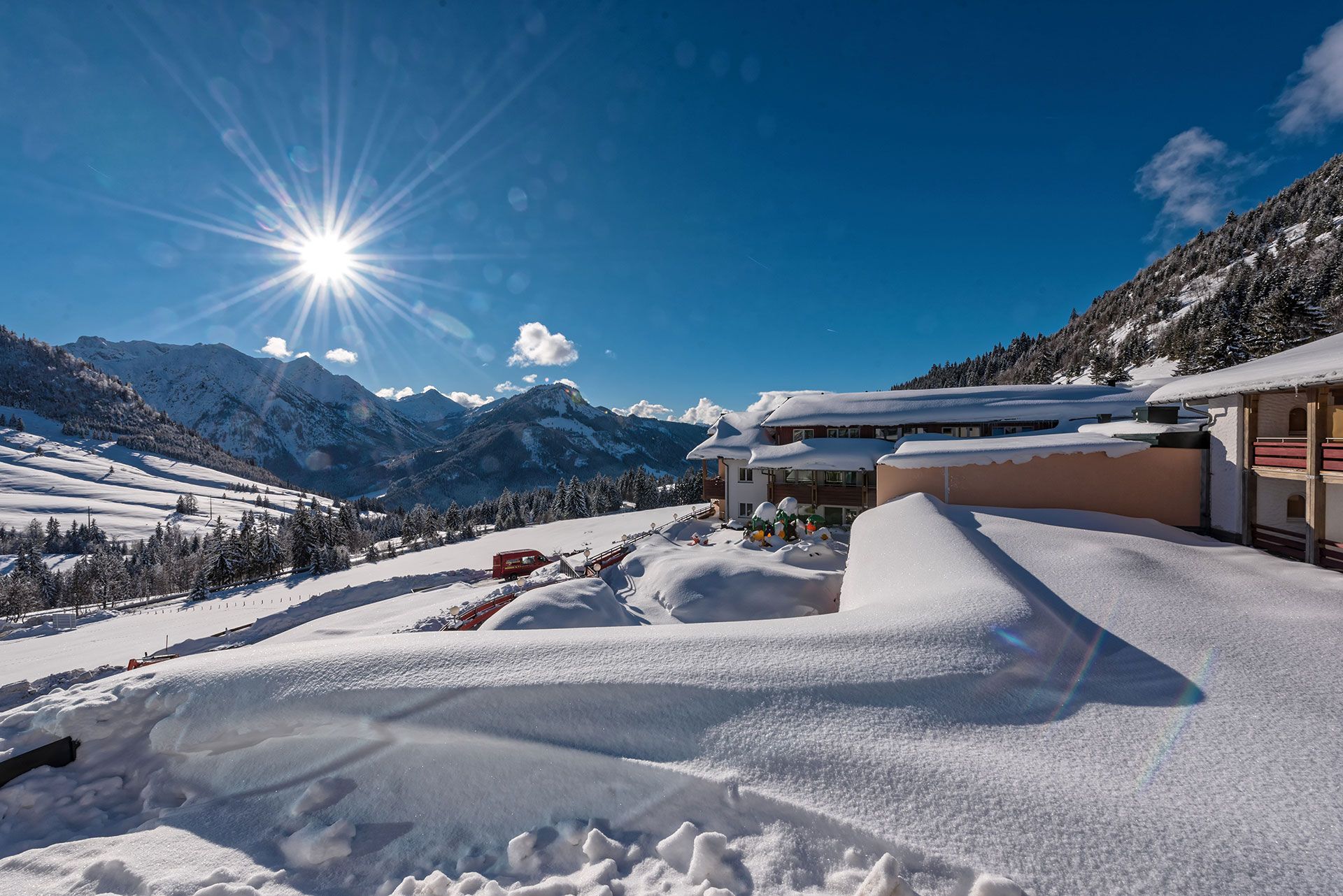 Die Alleinlage unseres Hotels am Ortsrand von Oberjoch bietet einen spektakulären Blick in die Allgäuer Alpen, direkt gegenüber vom Iseler-Plateau lässt sich das bunte Treiben im Wander- und Skigebiet beobachten.
